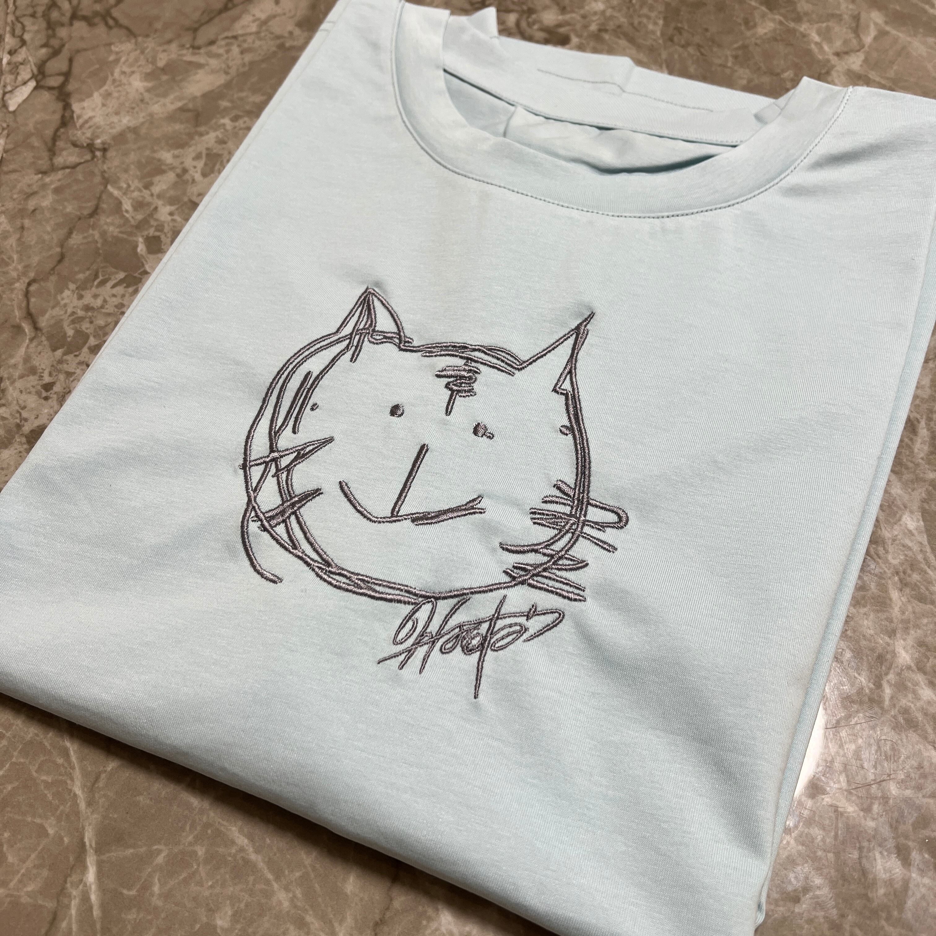 ラフな線で描かれた、ちょっぴりとぼけた笑顔のネコが刺繍されたTシャツです。