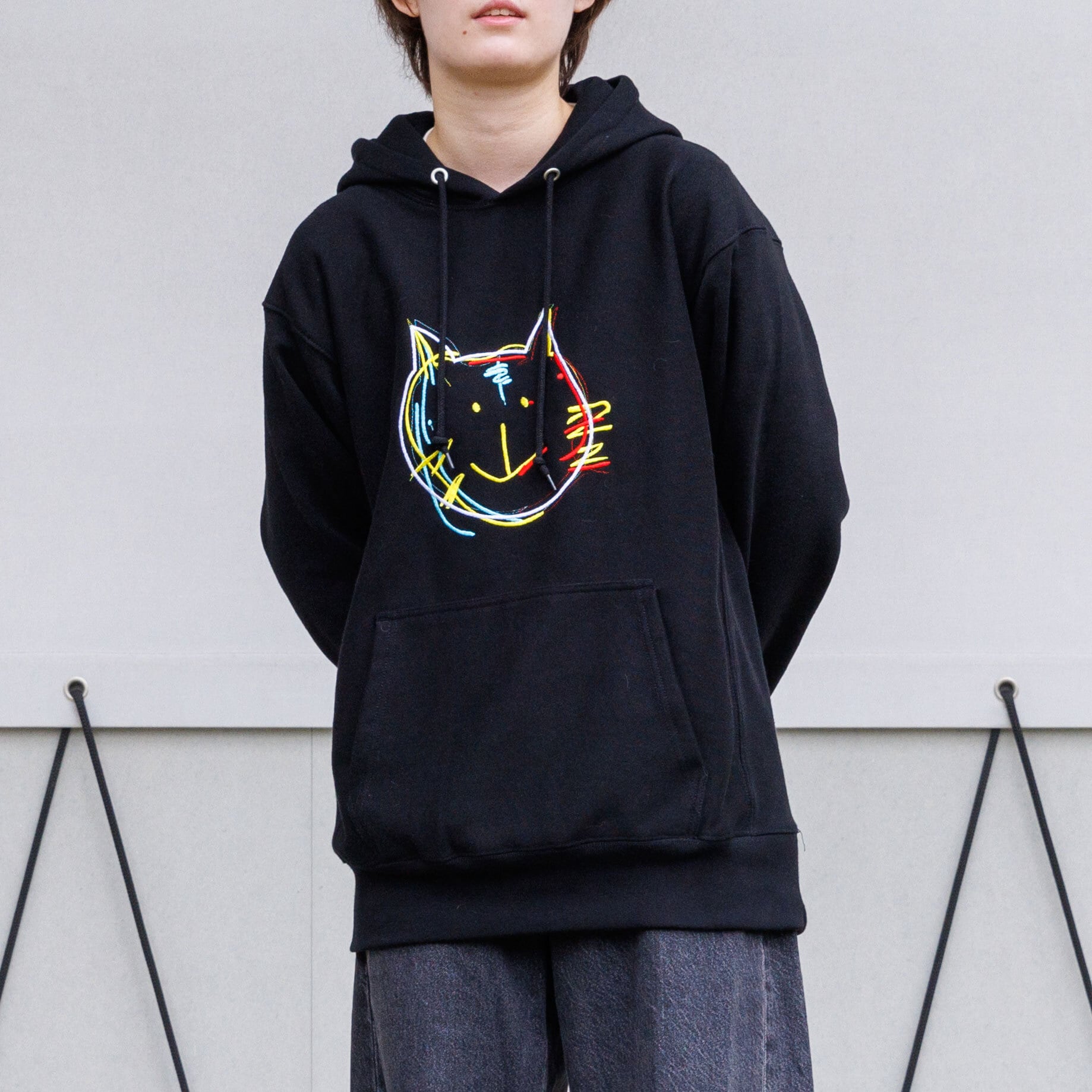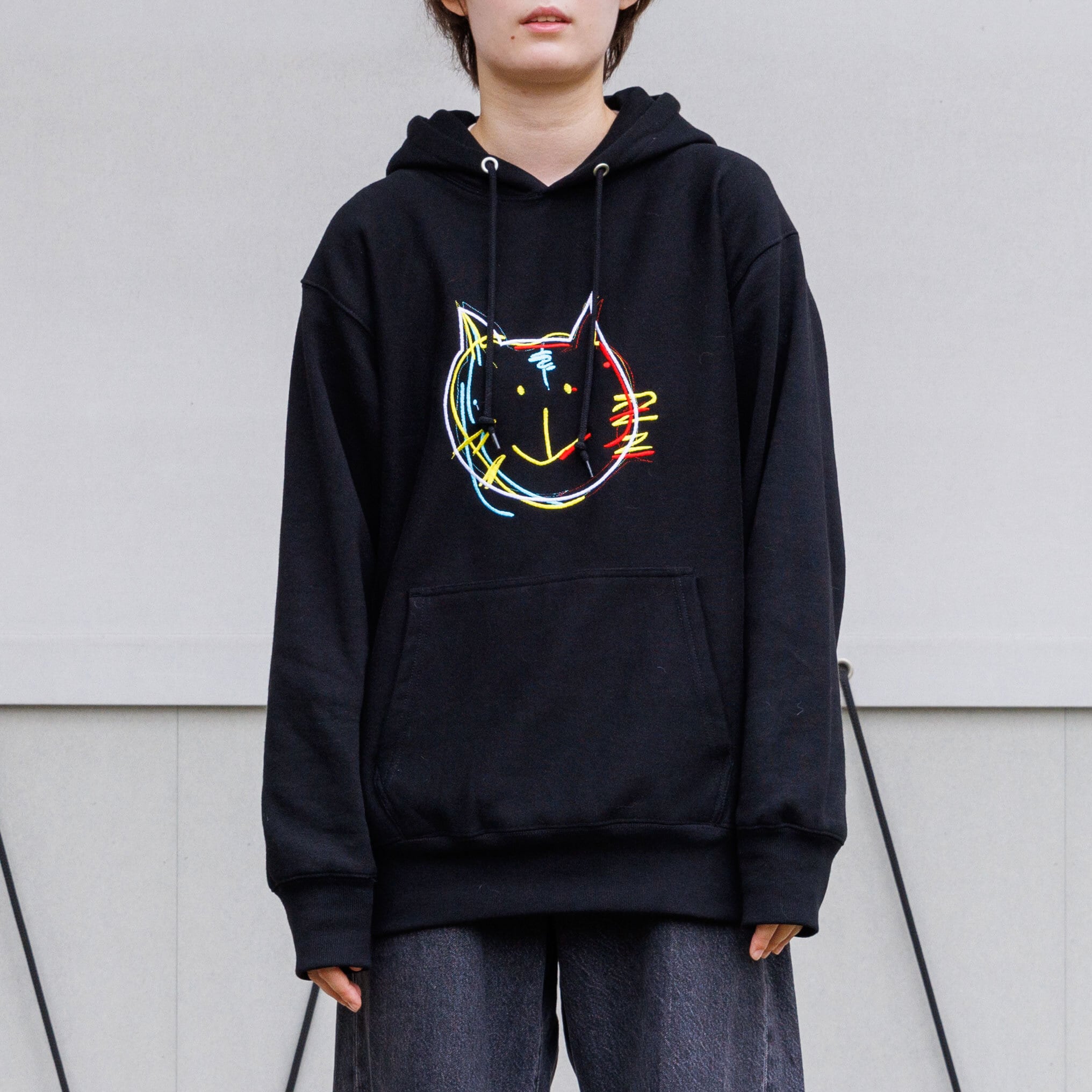 遊び心満載のラフな猫のパーカーです。12.0オンスとかなりの厚みがあるしっかりとした作りになっており、フードの立ちも綺麗に見えます。